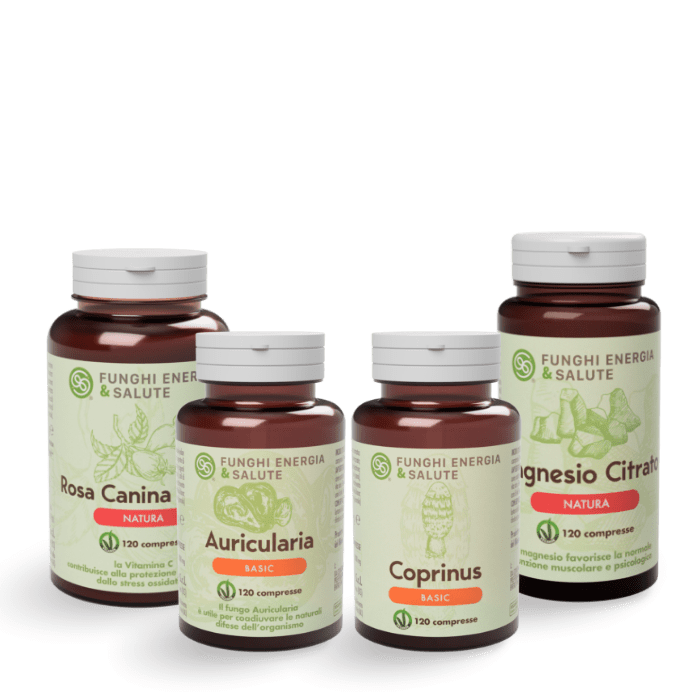 Abbiamo associato la Rosa Canina (Vitamina C) ed il Magnesio Citrato per migliorare l’efficacia del trattamento. La Rosa Canina (ricca di Vitamina C), contribuisce a far assorbire in modo più completo i principi attivi presenti nei Funghi Medicinali. Il Magnesio Citrato è un minerale di estrema importanza per il nostro metabolismo ed il benessere generale.